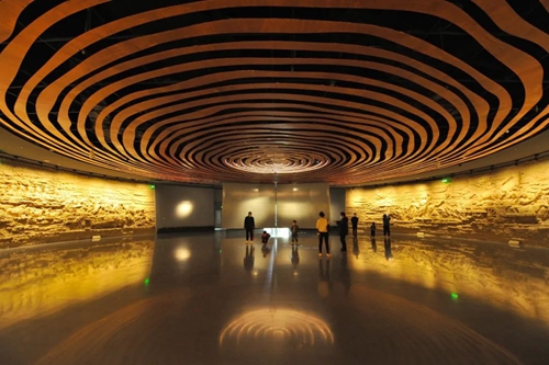 鄭州商代都城遺址博物院坐落于鄭州市市中心,序廳鏤空的洛陽鏟造型,寓意鄭州商代都城是一座由考古發(fā)現(xiàn)的千年王都。巨幅環(huán)形浮雕講述先商和商代故事。地面投影與年輪頂飾上下呼應(yīng),寓意鄭州古今同地,歷史文化一直延續(xù),3600余年的歷史有其根源,數(shù)千年的繁華有本可依。