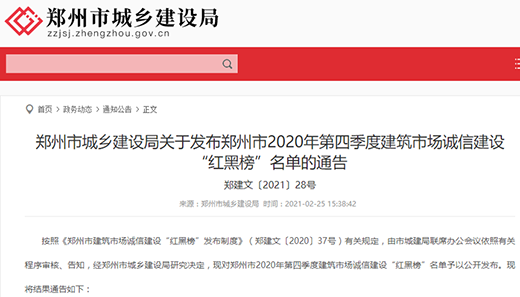 2月25日,鄭州市城鄉(xiāng)建設(shè)局發(fā)布鄭州市2020年第四季度建筑市場(chǎng)誠(chéng)信建設(shè)“紅黑榜”名單的通告(鄭建文〔2021〕28號(hào)),鄭州地產(chǎn)集團(tuán)投資管理有限公司榮登“紅榜”單位,趙玨榮登“紅榜”個(gè)人。