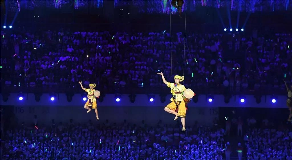 5塊總面積,超過3000平米的輕型透明網(wǎng)幕,130余臺高清投影機覆蓋上萬平米場地,通過威亞的技術(shù)手段和地面投影相呼應。地面、空中、立面多維度的表演空間,將各種特色民族元素呈現(xiàn)出來,呈現(xiàn)了各族人民的幸福生活,書寫出一張張民族文化名片。當現(xiàn)場各族人民跳起歡快的舞蹈,當各民族美麗的服飾在現(xiàn)場轉(zhuǎn)出最絢麗的弧度,展現(xiàn)出各民族團結(jié)奮進、朝氣蓬勃的精神風貌。作為河南特色的少林和太極兩個重要元素也在本次開幕式精彩亮相,由塔溝武校數(shù)千名演員演繹。隨著音樂節(jié)奏的轉(zhuǎn)換,他們變幻各種造型,動靜結(jié)合、氣勢恢宏,讓觀眾更加了解精彩河南。