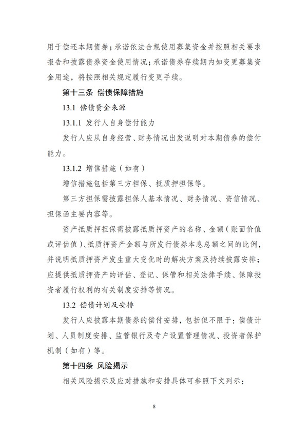 (二)發(fā)行人應(yīng)按照監(jiān)管部門(mén)和交易場(chǎng)所的規(guī)定,在存續(xù)期內(nèi)定期披露財(cái)務(wù)情況、經(jīng)營(yíng)情況、募集資金使用情況、項(xiàng)目進(jìn)展情況等相關(guān)信息。如存續(xù)期內(nèi)變更募集資金用途或發(fā)生其他對(duì)債券持有人權(quán)益有重大影響的事項(xiàng),應(yīng)符合相關(guān)法律法規(guī)和政策要求,按照有關(guān)規(guī)定或約定履行程序,并及時(shí)公告。